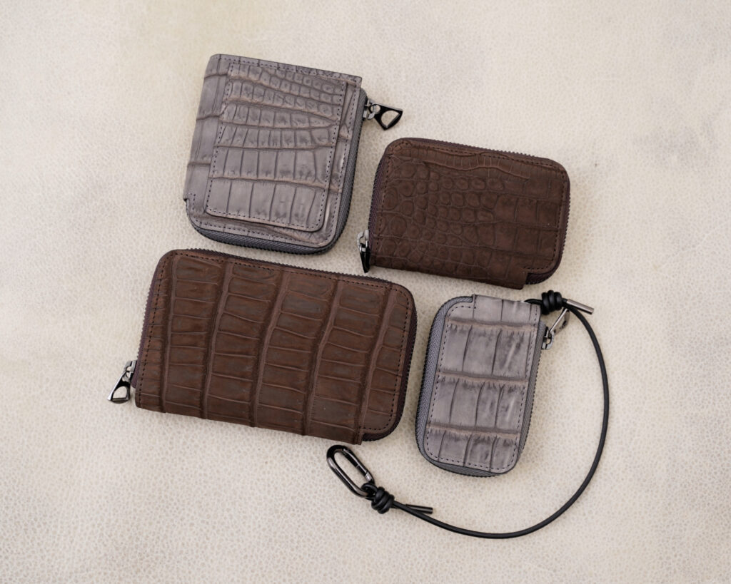 ヌバッククロコダイルを使用した特別なコレクションとなっており、ITTI で人気のウォレット3型、キーケース1型をグレー、ブラウンの2色にて展開。