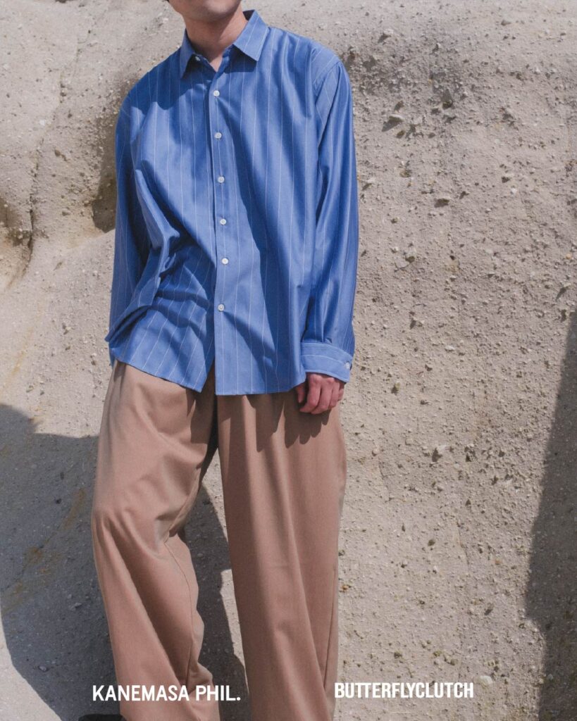 シャツは、定番として展開されてきた「46G Atmosphere Stripe Shirt」をベースに、インラインでは展開のなかったウルトラマリン、コヨーテの2⾊をセレクト。